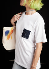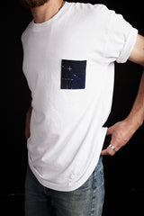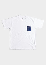 A series of leftover, unused white tees that have been reimagined with a hand-constructed and hand-stitched pocket from antique Japanese Boro fabrics. No two tees are exactly the same.