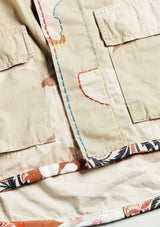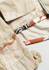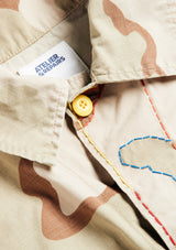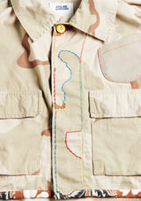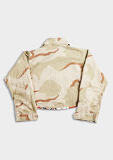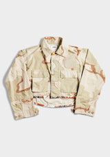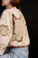 Original US Military Desert Storm Field Jacket, reimagined to never go to war again. Each unique jacket is transformed utilizing leftover and vintage total fabrics for subtle pockets and detailing, rainbow-thread hand-stitching outlines the camo design along the placket and is cropped to waist length for a feminine fit.