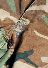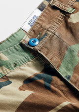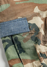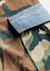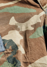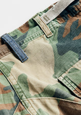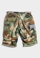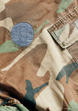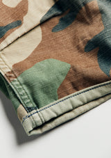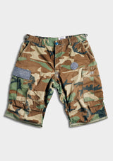 A mix of US army camouflage shorts reimagined to never go to war again. Each pair features repairs and embellishments in leftover chambray and Shelter Half fabrics. Each pair is cropped to a knee-grazing length and finished with a reverse hem.