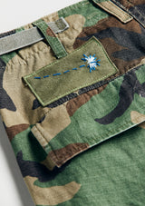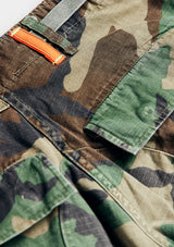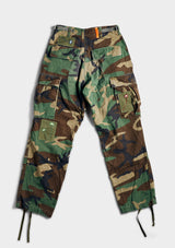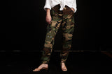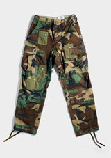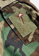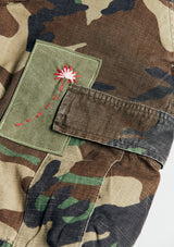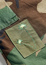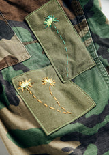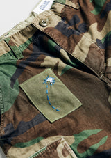 A mix of US army camouflage pants reimagined to never go to war again. Each pair has been meticulously reimagined with hand-embroidered floral patching. Original length and fit. Our signature reversed hem finish.