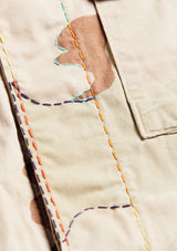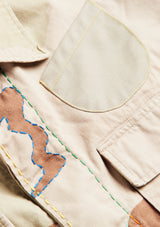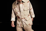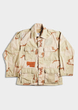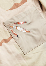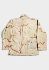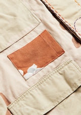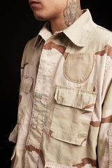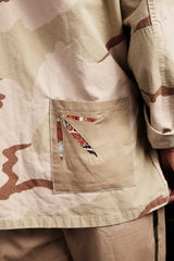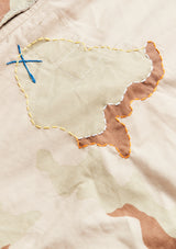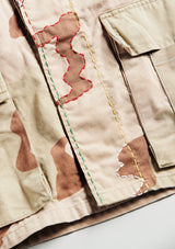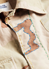 Original US Military Desert Storm Field Jacket, reimagined to never go to war again. Each piece utilizes leftover and vintage fabrics in total colors for subtle pockets and detailing and rainbow-thread hand-stitching outlining the camouflage design along the placket. No two jackets in this series are the same.